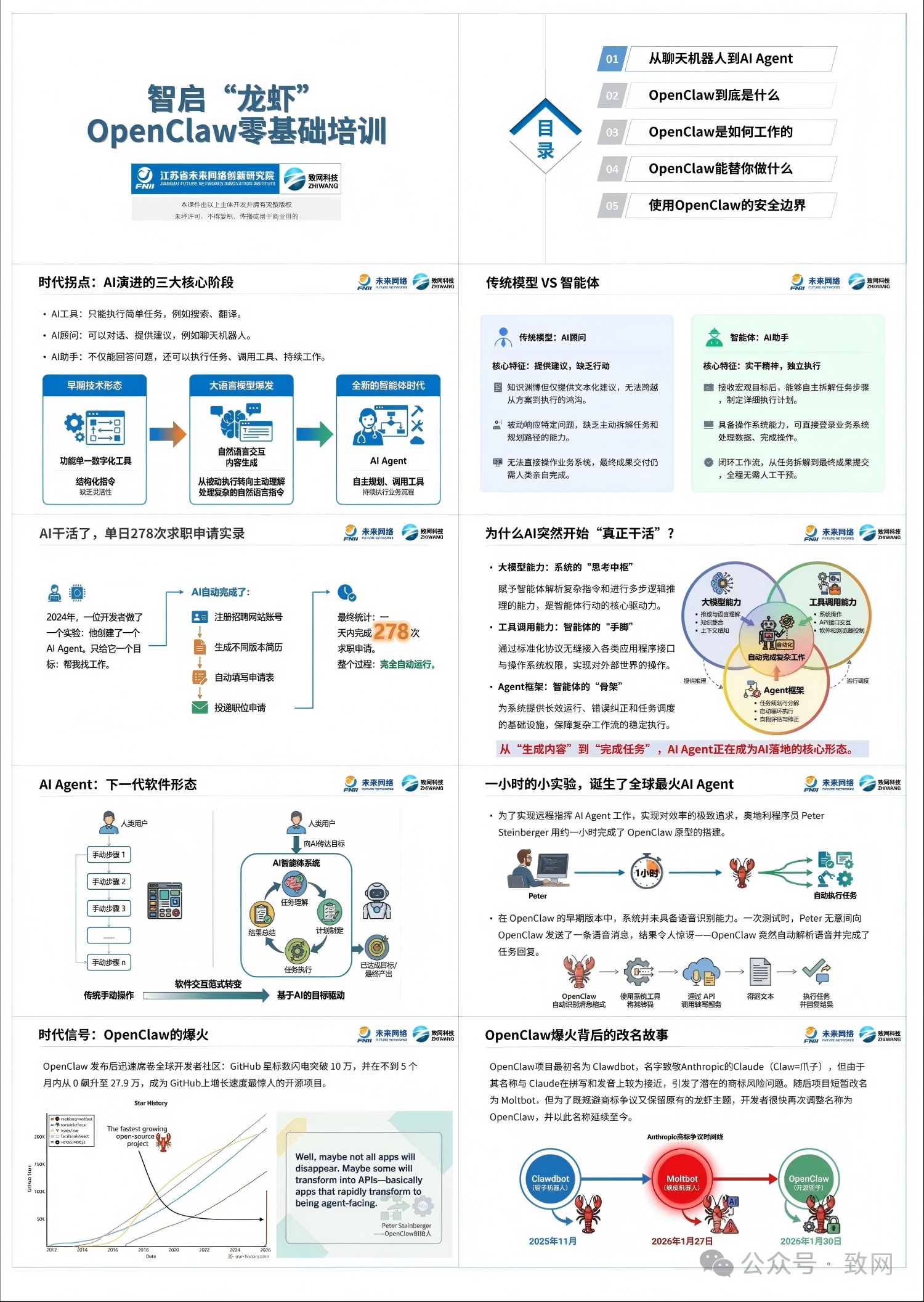 虽然培训已过,但致网科技的技术分享从未止步。作为本次培训的承办方及课件开发核心团队,致网科技将培训精华整理为全套PDF课件(理论科普+实操手册),现面向公众免费开放,助力更多开发者与企业从零开始快速掌握OpenClaw,释放智能体生产力。